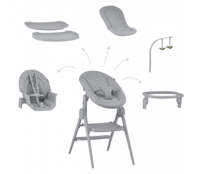 3-еуі 1-еуінде әмбебап жинағы: жаңа туған нәрестелерге арналған орындықтан бастап, тамақтануға арналған орындыққа және белсенділік мұнарасына дейін, балаңыздың өсуіне сәйкес бейімделеді.